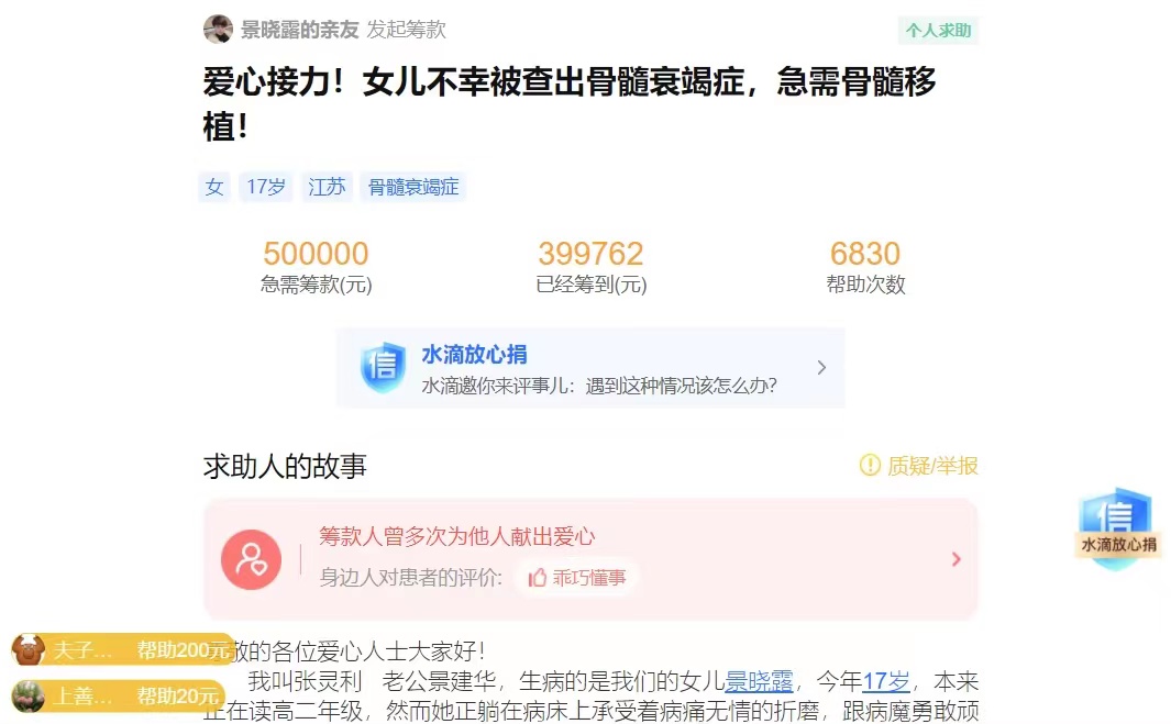 2017年,张灵利的大女儿景晓露被查出患有致残性硬斑症,从那时起她便带着女儿求医问药,几乎花光了家中所有积蓄。然而屋漏偏逢连夜雨,2021年10月,大女儿又不幸被确诊为骨髓衰竭症,只有进行骨髓移植手术才能彻底治愈,但巨额的医疗费让这个本就困难的家庭陷入了绝境。“当时感觉天都要塌了”,张灵利说,“做骨穿时,穿刺针插入她的腰部,穿过骨质,却刺穿了我的心”。